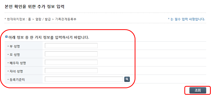 성명/주민등록번호를 정확하게 입력하셔야 정확한 가족관계 증명서를 발급받을 수 있겠죠??