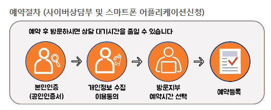 방문예약은 상담센터 1600-5500이나 사이버 상담부 및 스마트폰 앱을 통해 가능합니다.